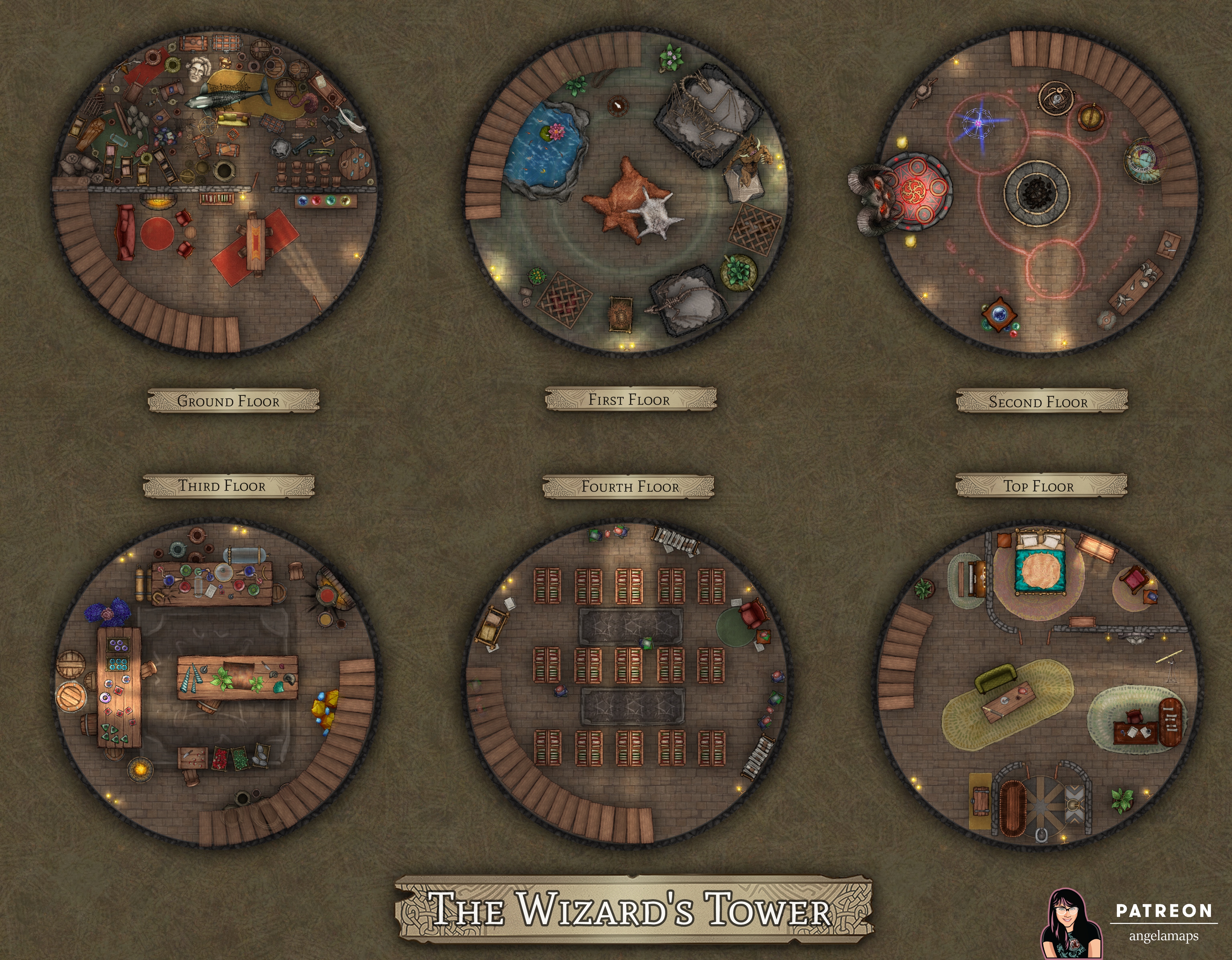 Six floor wizard tower battle map encounter for D&D and pathfinder TTRPGs