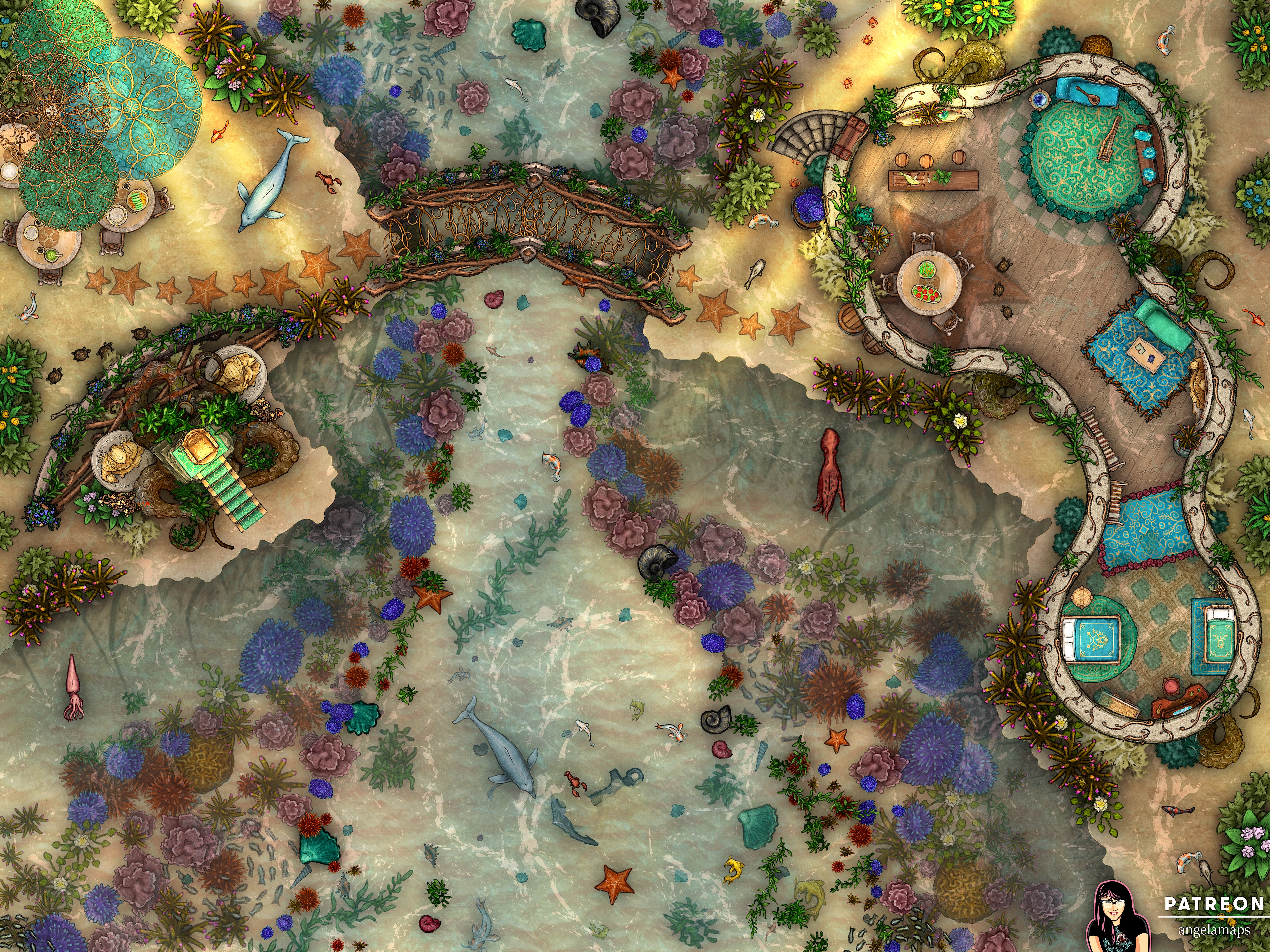 When I made this map what I had in mind was Sea Elves (or Aquatic Elves, or Alu’Tel’Quessir) but I think this map could also work for something sort of Atlantis themed or even possibly merfolk if that suits your game better 🙂 Regardless, I hope you have a use for it in your underwater adventures!