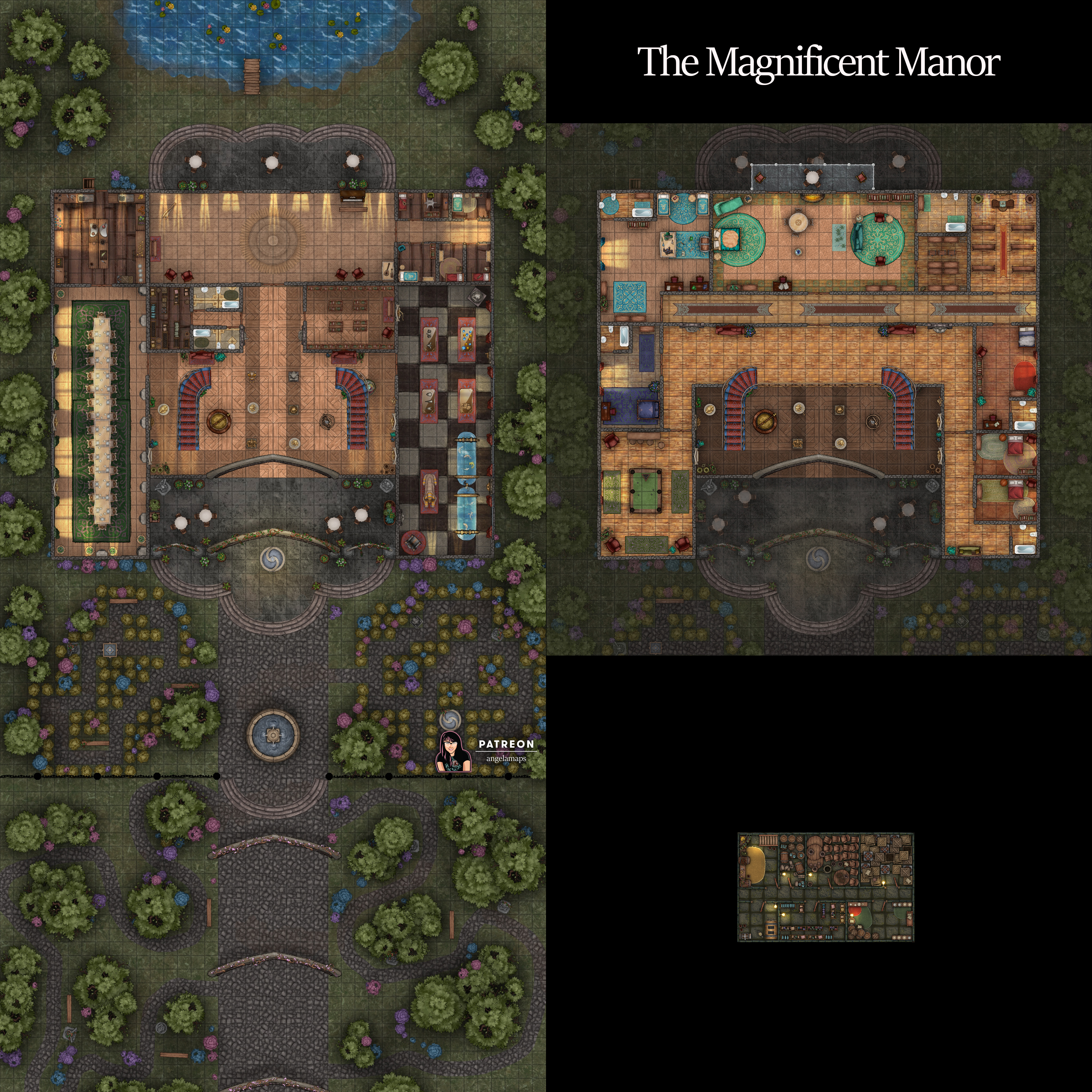 This one took me a very long time 🙂 I have split it up into several maps so you can download in whatever way works best for you. I have the first floor and the grounds together as one big map the way I created it, but also as “The Manor” and “The Grounds” as separate maps. And both “The Upstairs” and “The Cellar” as separate maps.