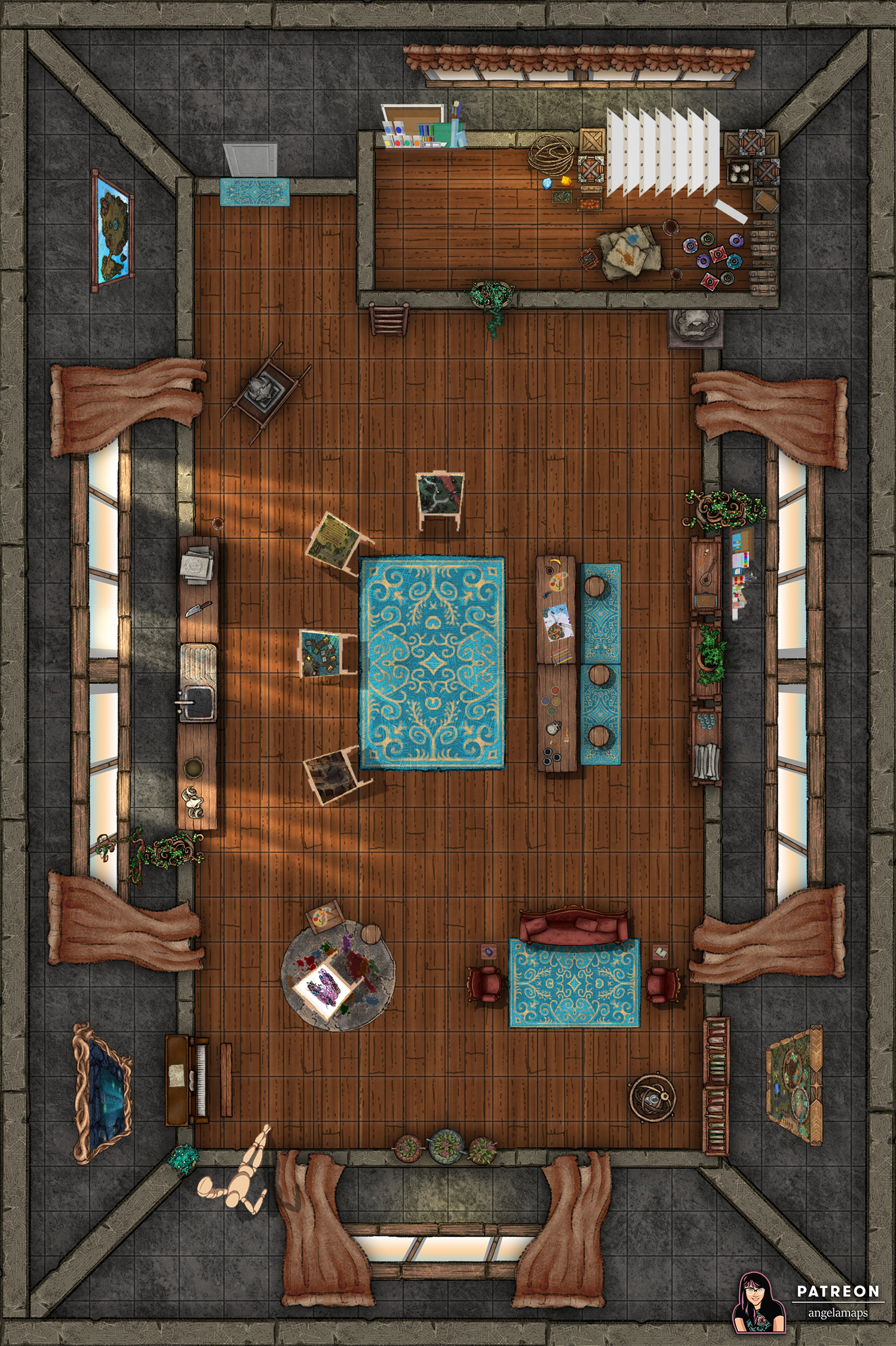 The idea for this map was given to me by one of my patrons who needed it for a one shot. His artist is a murder and the players can go into these paintings. As such, the paintings are also playable maps of mine. This was a lot of fun to make 🙂 Also tried to work a little more with forced perspective.