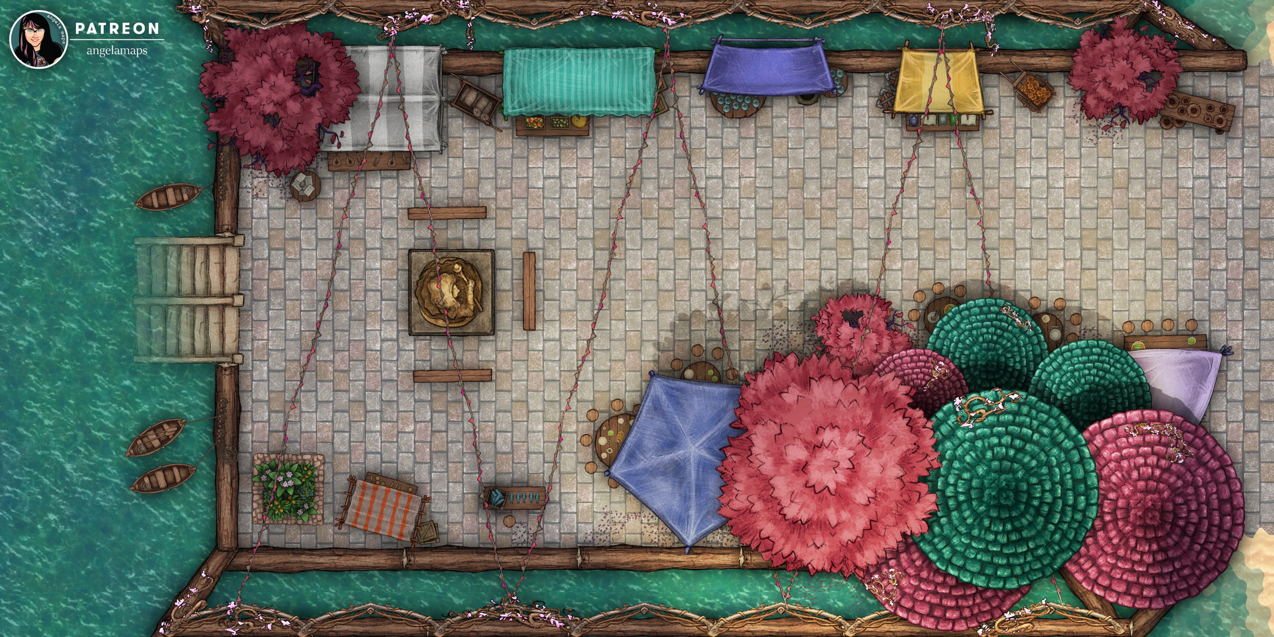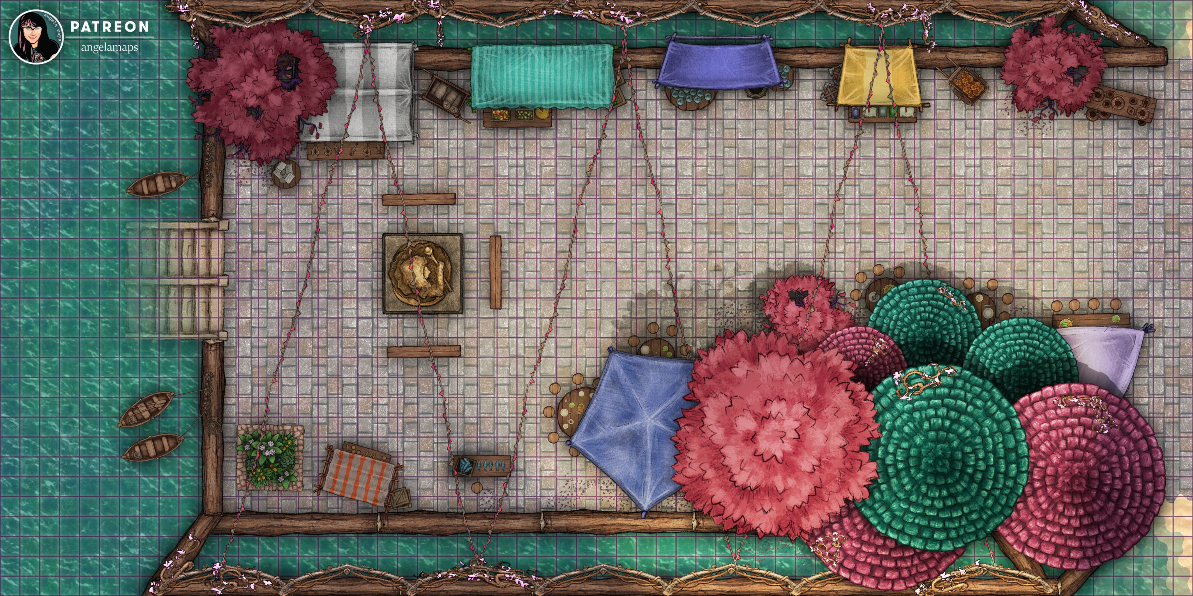 The water market is the best place in town to get some fresh produce, grab a bite to eat, or find some handmade treasures… all while enjoying a cool sea breeze. This map is available in 3 extra flavors for my Big Damn Hero and above patrons and as always they also get the Fantasy Grounds files 🙂