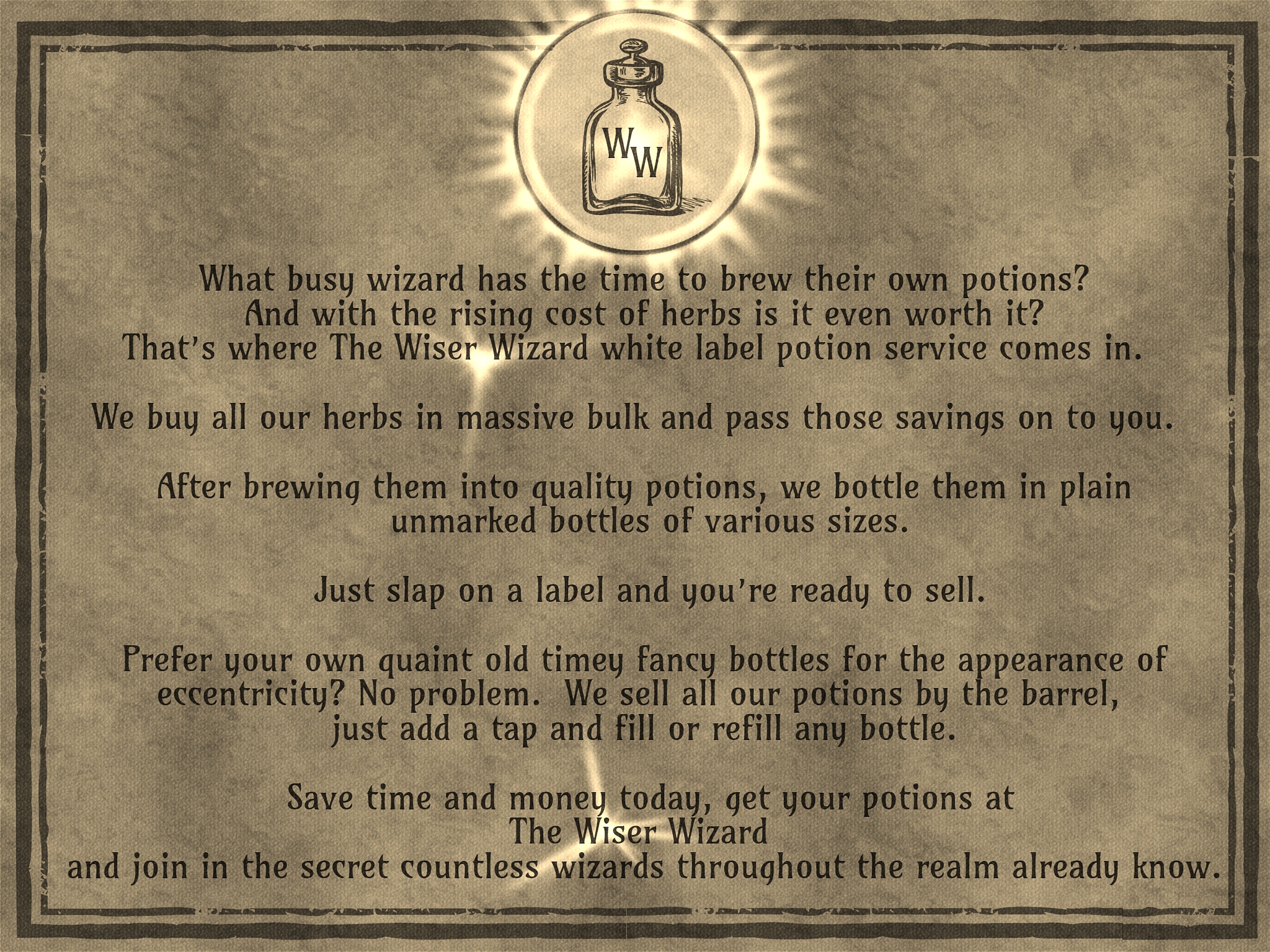 That’s where The Wiser Wizard white label potion service comes in. We buy all our herbs in massive bulk and pass those savings on to you. After brewing them into quality potions, we bottle them in plain unmarked bottles of various sizes. Just slap on a label and you’re ready to sell.