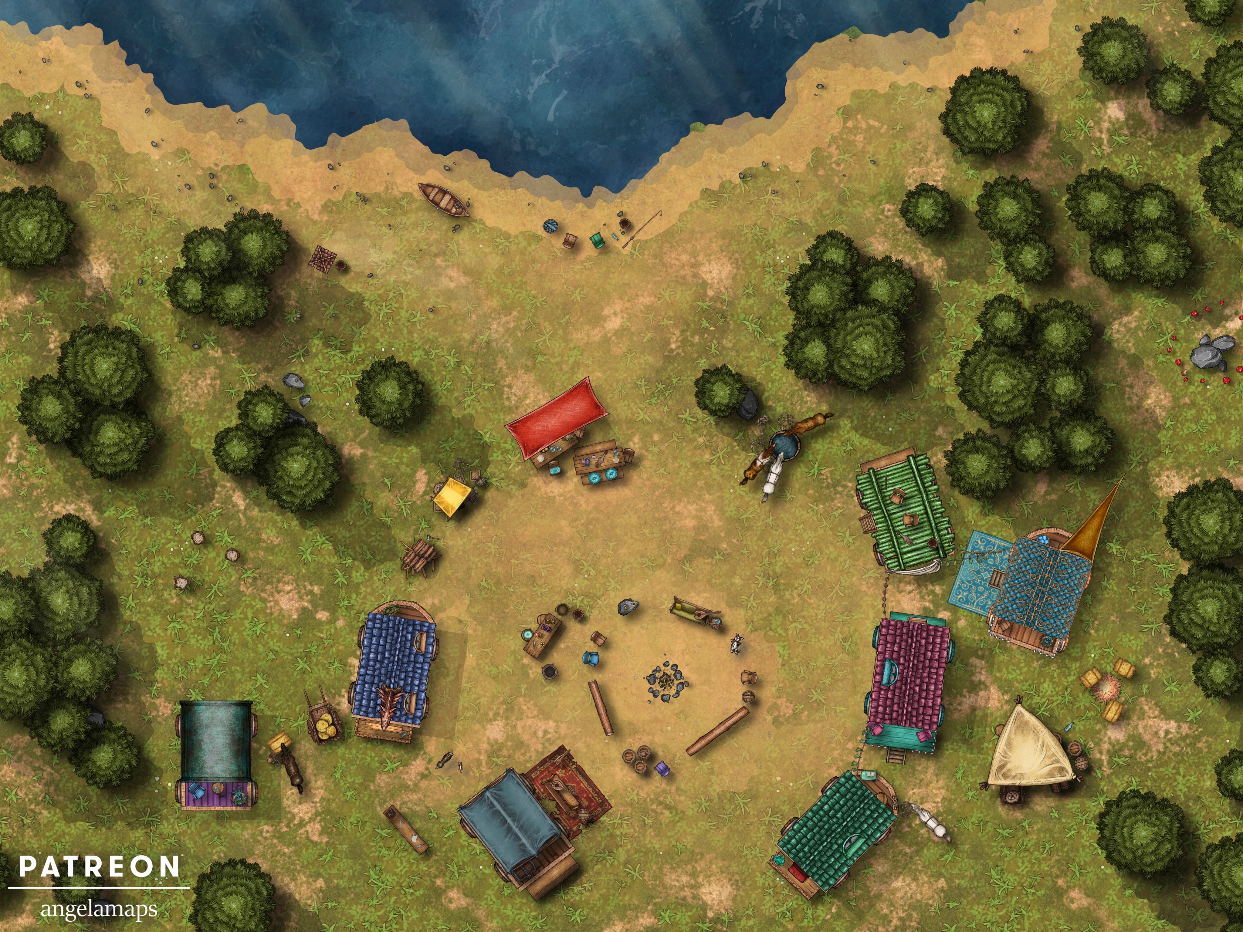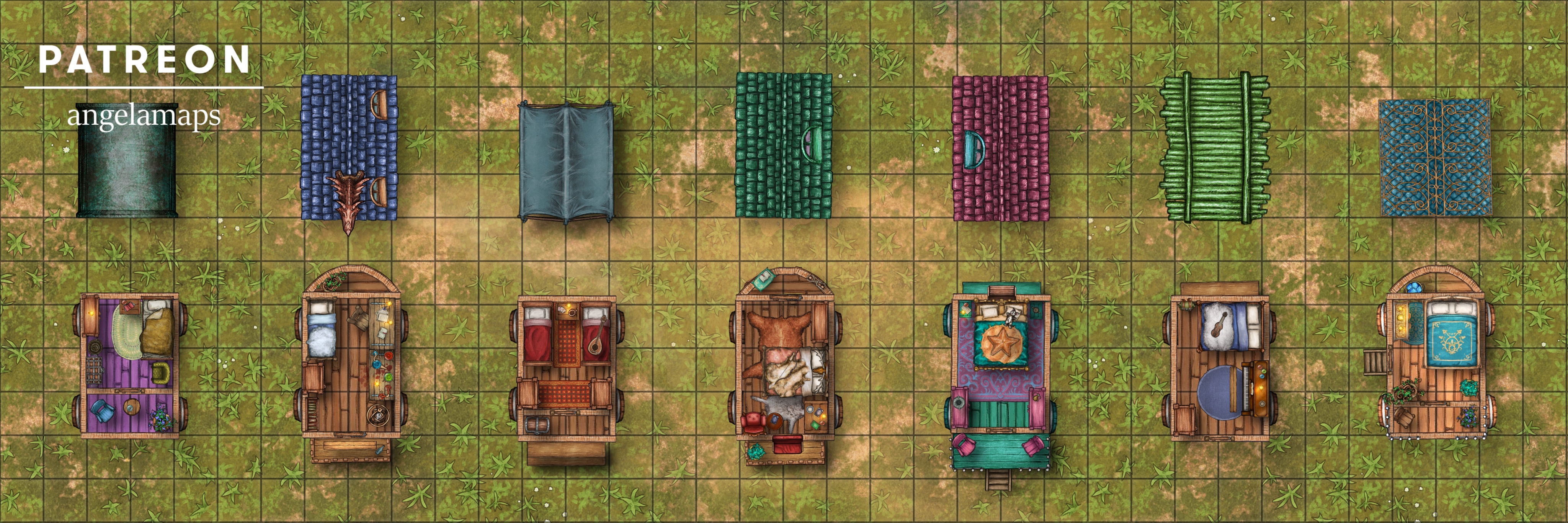 The caravan consists of seven homes on wheels, currently parked near a lake. Are the residents friendly and able to help you? Or maybe they need your help? Perhaps someone is hiding amongst them that you need to find? Also included is a map of the caravan interiors. They are laid out in a linear fashion to make it easy for adventurers to explore them on a grid, since they are pretty small (2 squares by 3 squares.)