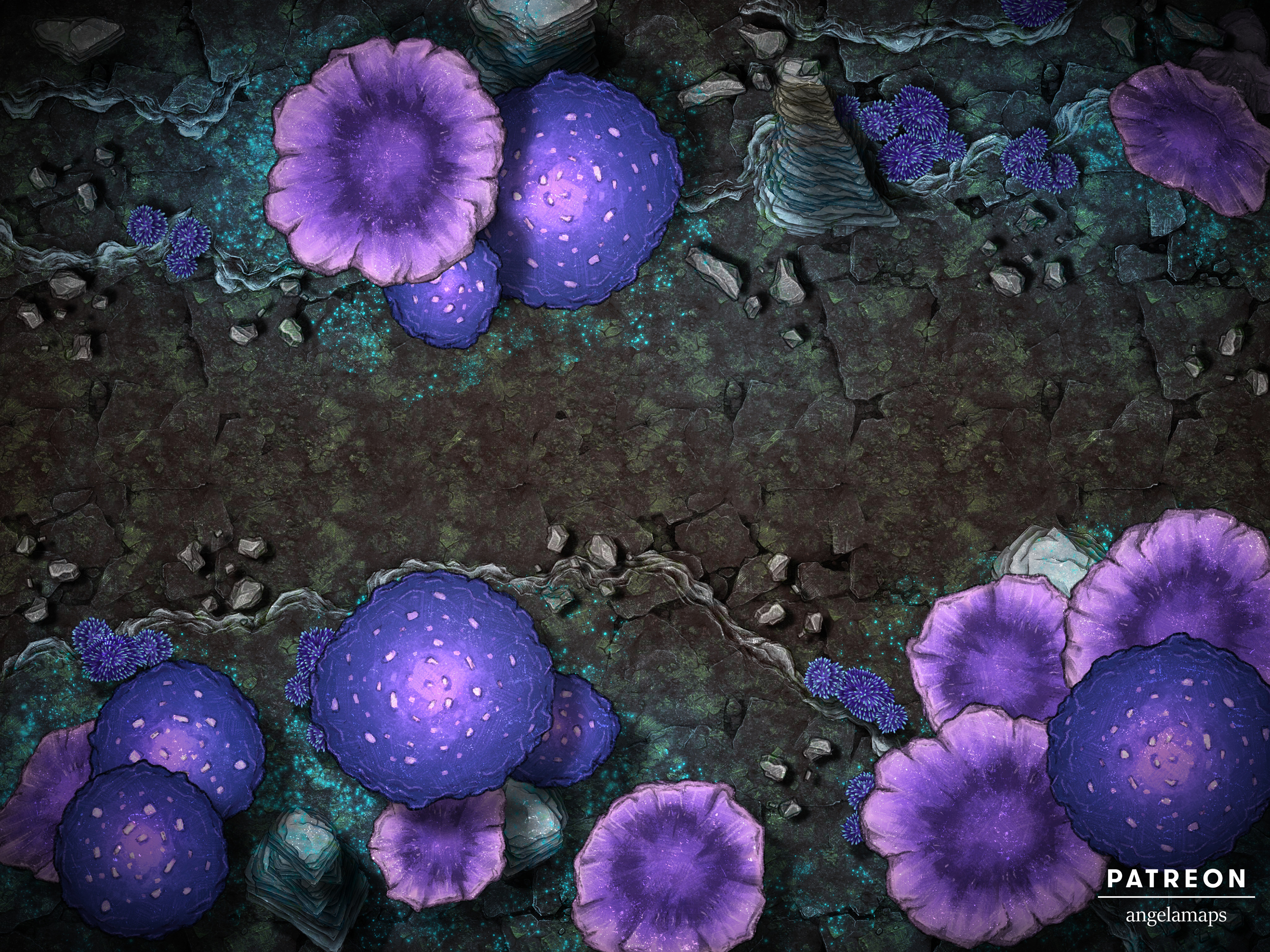 Mushrooms! Specifically sorta glowy underdark mushrooms with these bluish spores that litter the ground around them. The first map is free @ 4000×3000 px using the download below (or without the logo on my patreon) and the second map (with the lake) is available to my Adventurer and above tiers. Big Damn Hero and above also get the Fantasy Grounds .mod file 🙂