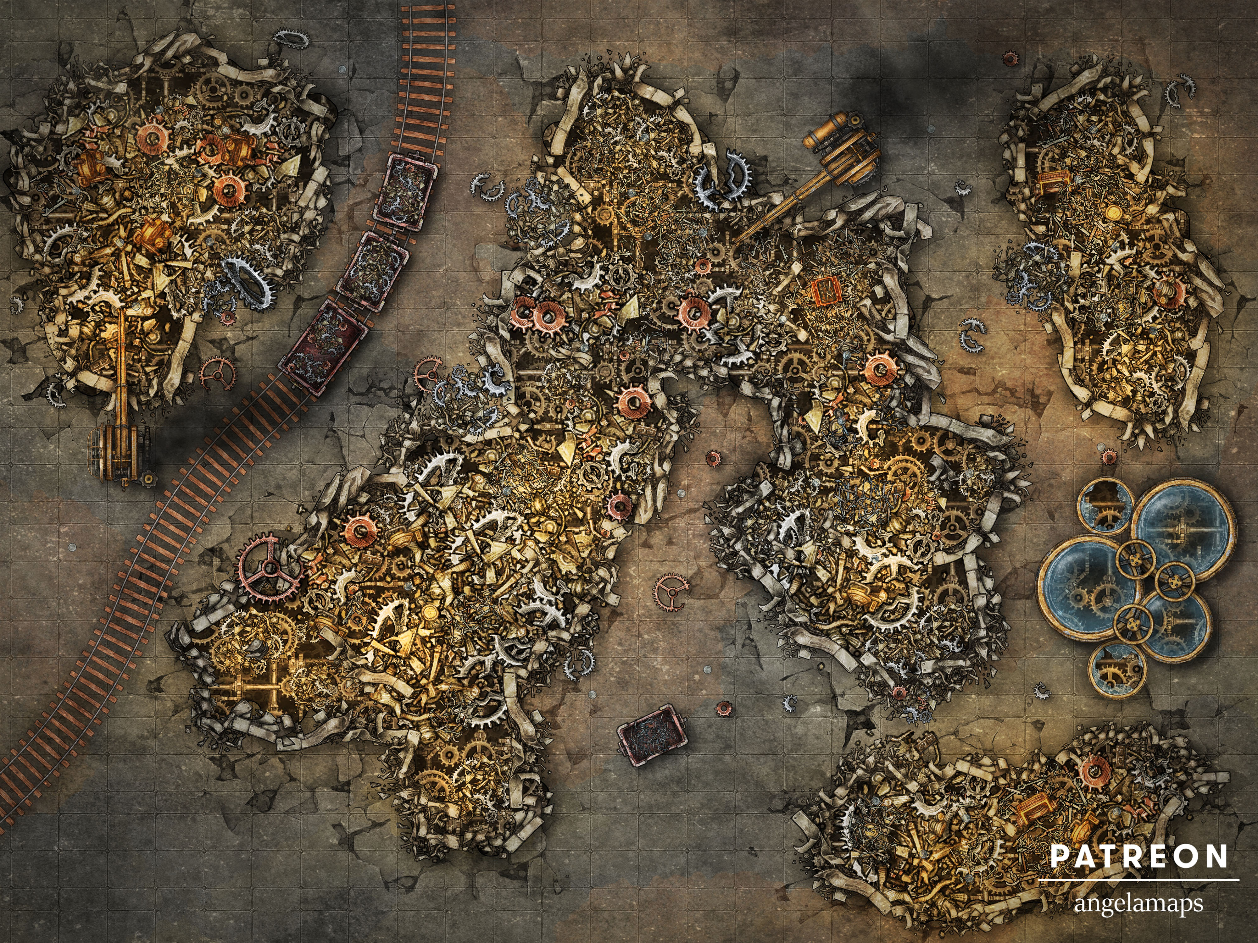 Scrap yard or modron grave site with four versions, D&D battle encounter map.