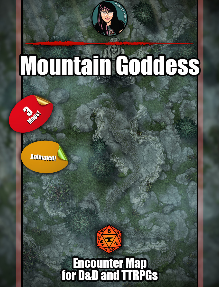 High upon the bluffs, where mist and fog entwine with the lowest wispy tendrils of the clouds, an ancient stone statue stands, beckoning to those bold and hardy enough to have braved the steep climb. Is her serene expression that of a benevolent deity, providing shelter from the elements, the cryptic smile of a goddess of mysteries, inviting truth-seekers to her crucible, or the deceptive smirk of some foul divine trickster, luring weary pilgrims to their demise? Fully animated and available in snowy and summery variants, let the Mountain Goddess lure your players to their salvation, or their doom!